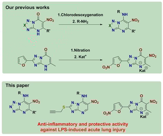 Hence, the purpose of the present work was to evaluate novel members of the nitroazoloazine class, such as nitrotetrazolopyrimidines, nitrotriazolopyrimidines and water-soluble dinitroderivatives, as potential agents against excessive inflammation during LPS-induced lung injury.