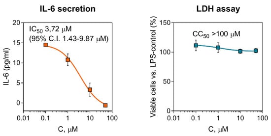 Therefore, we choose the phenotypic drug discovery approach to identify novel lead compounds against cytokine overproduction and inflammation-induced tissue damage. In this case, we can avoid failures associated with in vivo validation of hits and leads identified in biochemical target-based screening. Instead, phenotypic leads were naturally selected in a cell-based model. Primary mouse macrophages were stimulated by E. coli LPS to induce M1-polarization. Firstly, the activity of the compounds was evaluated as the ability to inhibit NO synthesis, and compounds that suppress it by 40% or more at a concentration of 100 μM were considered promising if their cytotoxicity was less than 20%. In the second step, hit compounds were studied in a wide range of concentrations as inhibitors of NO synthesis and IL-6 secretion, which is considered a key mediator of cytokine release syndrome and severe COVID-19 [39,40,41,42]. A similar approach has been previously used by other authors to identify anti-inflammatory compounds [16,43] and proved to be successful.
