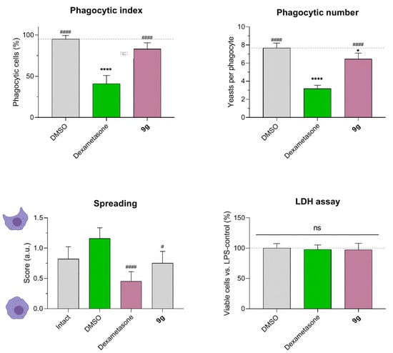 After 24-h of incubation, dexamethasone, but not compound 9g, significantly suppressed phagocytosis (data not shown). As shown in Figure 4, after 72 h of incubation, the proportion of phagocytes in the dexamethasone-treated cells further decreased from 57% to 41%, which coincides with the literature’s data [28,29]. The mean number of phagocytosed yeast cells was decreased by 59%. Compound 9g preserved macrophage phagocytic activity and reduced the mean number of phagocytosed particles by 16%. No cytotoxic properties were noted for the tested compound during the experiment. In addition, macrophage spreading was visually scored. Spreading is a well-known phenotypic marker of cell activation, and phagocytic capacity is limited by the amount of available membrane [30,31]. Yeast non-significantly stimulated macrophage spreading, while 9g treatment reduced it to a nearly unstimulated level. The effect of dexamethasone was even more significant. We may conclude that dexamethasone showed a pronounced immunosuppressive effect, while compound 9g preserved the innate phagocytic activity of macrophages.