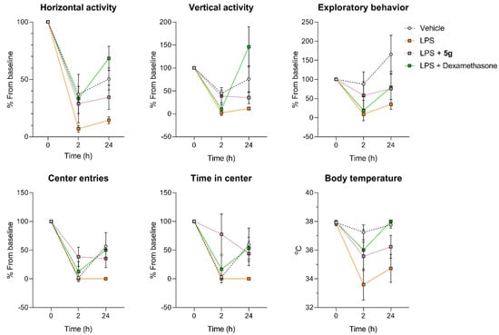 In a mouse model of LPS-induced acute lung injury, compound 9g restored anxiety-like behaviors caused by LPS, reflected in the amelioration of motor and exploratory activity in an open field test [44]. Dexamethasone and 9g also attenuated LPS-induced hypothermia in mice. A similar effect was observed for dexamethasone previously [45].