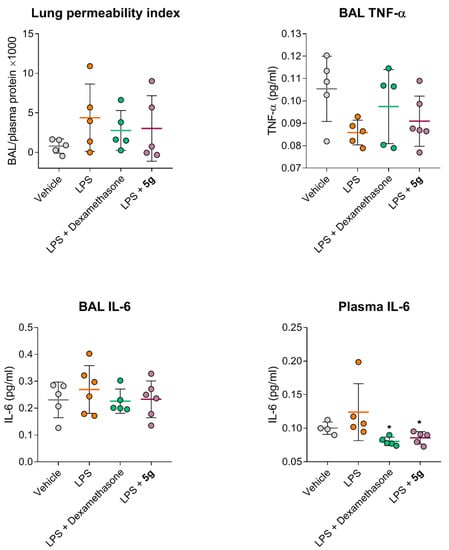 Effect of compounds on biochemical markers of LPS-induced lung injury and inflammation in C57bl/6j mice. Data are shown as mean ± SD; * p < 0.05 (One-directional ANOVA with Dunnett’s post-test). BAL—bronchoalveolar lavage.
