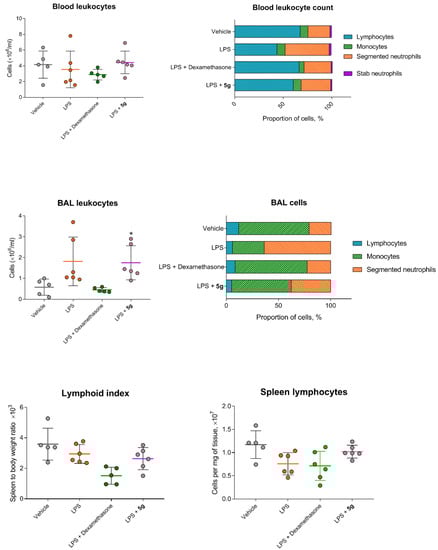 The leukocyte count in control animals with LPS-induced inflammation showed a similar pattern. Dexamethasone has a pronounced ability to ameliorate inflammatory processes, significantly reducing the proportion of mature segmented neutrophils compared to those in animals from the LPS group. The change in the leukocyte formula after 9g treatment is also due to the restoration of the neutrophils to lymphocytes ratio. Both dexamethasone and 9g normalized leukocyte subpopulations to the values of intact animals.