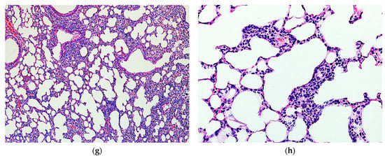 Histological examination of the lung 24 h after LPS administration revealed massive infiltration with polymorphonuclear neutrophils in the interstitial tissue and purulent exudate in the lumen of the alveoli and pulmonary bronchioles (Figure 8) compared with animals of the control group without LPS. Immune cell infiltration was associated with diffuse alveolar damage and interstitial edema by congestive atelectasis. In the case of local swelling of alveolar walls, compensatory thinning and overstretching of interalveolar septa were noted in another part, accompanied by diapedesis of erythrocytes. After administration of dexamethasone to LPS-treated animals, moderate thickening of the interalveolar septa was observed due to edema and the accumulation of macrophages and macrophage-like cells in the interstitial tissue. The lung tissue of animals administered with 9g was characterized by limited focal infiltration of the interalveolar septa with neutrophils.