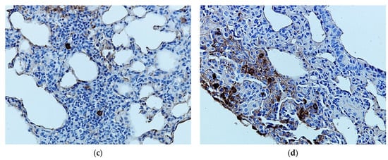 Lung sections. Immunostaining for CD68+ cells and Mayer’s hematoxylin for nuclei, magnification ×400: (a) Intact control; (b) LPS-control; (c) LPS + 5 mg/kg dexamethasone; (d) LPS + 30 mg/kg 9g.