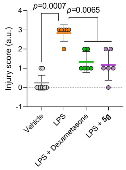 We also performed a semi-quantitative assessment of morphological markers of inflammation as described previously [33]. Lung tissue damage was determined as the incidence of hemorrhage and neutrophil infiltration. It was shown that LPS-induced lesions were significantly ameliorated by dexamethasone and compound 9g with comparable efficacy (Figure 10).