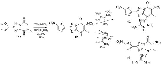 An alternative synthetic route was applied for the synthesis of water-soluble salts of dinitrotriazolo[1,5-a]pyrimidines 13 and 14. It includes nitration of the azoloazine 11, which leads to electrophilic substitution of hydrogen with nitro-group in both the pyrimidine cycle and the furyl substituent to form a dinitro derivative 12. Heterocycle 12 is a strong NH-acid due to the electron-withdrawing effect of the nitro group. This property was used to synthesize water-soluble forms of nitroazolo[1,5-a]pyrimidines 13 and 14 by reaction with aminoguanidine bicarbonate and guanidine hydrochloride (Scheme 2).