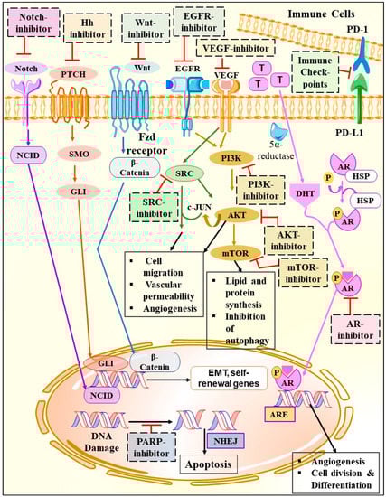 In the following section, we have concentrated on the available potential targets of TNBC, which includes some signaling pathways like angiogenesis, Hedgehog (Hh), Notch, Wnt/β-catenin, PI3k/AKT/mTOR, TGF-β, and Src kinase signaling pathways, and some specific receptors like EGFR, IGF 1R, PARP1 targeted receptors, programmed cell death ligand 1 pathway (PDL-1) targeted receptors, chondroitin sulfate proteoglycan 4 (CSPG4) protein targeted receptors, cytotoxic T lymphocyte antigen 4 targeted receptors (CTLA-4), and androgen receptors (AR) (Figure 3).
