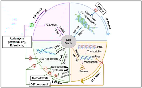 Based on various clinical trials and research studies, the national comprehensive cancer network guidelines recommended administration of combinatorial chemotherapeutics regimens for the treatment of TNBC like Taxane + Adriamycin + cyclophosphamide (TAC), Taxane + cyclophosphamide (TC), Adriamycin + Cyclophosphamide (AC), Cyclophosphamide + Methotrexate + Fluorouracil (CMF), Cyclophosphamide + Adriamycin + Fluorouracil (CAF), and Cyclophosphamide + Epirubicin + Fluorouracil + Taxane (CEF-T) [133]. Figure 4 describes the different mechanism of action of the combined drug regimen, revealing the essence of combination therapy.