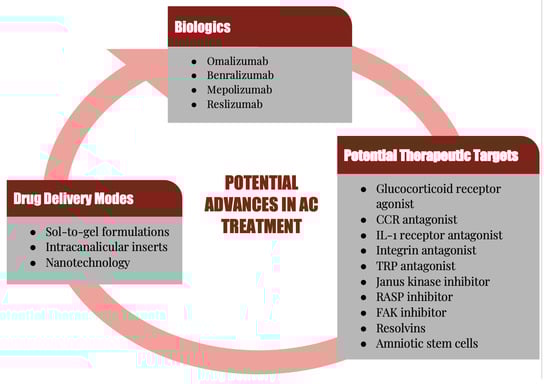 Although AC has always been a predominant form of conjunctivitis, it has increased in the last several decades, and is one of the most commonly encountered conditions by both allergists and eye care practitioners, affecting many patients and their quality of life [12,13,14,15]. Because of the high prevalence and the multifactorial causes of AC, a combination of therapies is often necessary to treat the associated signs and symptoms. This also creates a heavy economic burden, necessitating effective and novel treatment approaches, hence the ongoing research for additional therapeutic targets [10]. In this review, the cells and molecules that play a major role in the immunopathogenesis and immunopathology of AC will be highlighted. Current and potential future therapeutic agents that can prevent or treat the clinical expressions of AC via attenuation of the pathological and immune mechanisms of AC will be discussed (Figure 1).