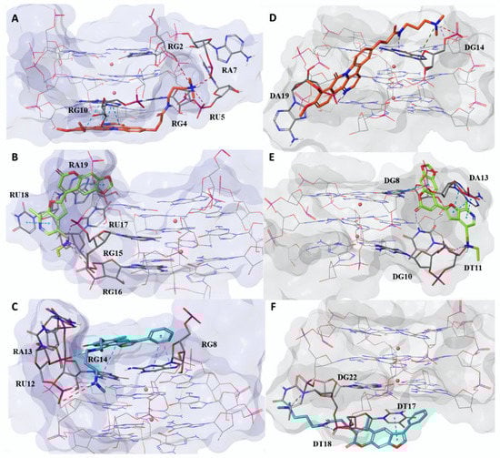 A docking pose analysis of the best thermodynamic complexes of hits 7 (panels (A,D)), 15 (panels (B,E)), and 17 (panels(C,F)) in complex with TERRA and Tel, respectively. For hits 7, 15, and 17, the ligand is depicted as orange, green, and cyan carbon sticks, respectively. The nucleic acids are shown as faded blue and grey surfaces for TERRA and Tel, respectively, while the guanine residues, forming the G-tetrads, are shown as lines. Moreover, the residues interacting with the ligands are depicted as faded blue and grey carbon sticks for TERRA and Tel, respectively. K+ ions are represented as pink spheres. Hydrogen bonds, salt bridges, and π–π and π–cation interactions are shown as dashed violet, red, cyan, and green lines, respectively.