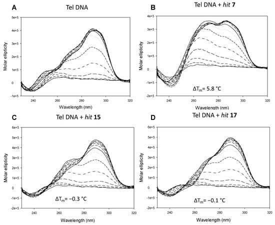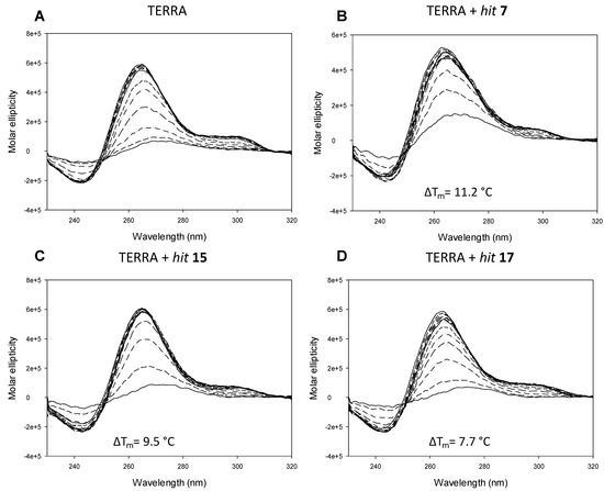The CD thermal unfolding spectra of the nucleic acid TERRA G4 4 μM in 100 mM K+ alone (A) and in the presence of hit 7 16 μM (B), hit 15 16 μM (C), and hit 17 16 μM (D).