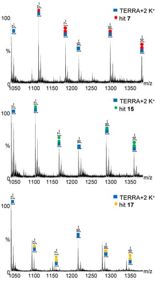 The MS spectra of TERRA (blue squares) incubated with the indicated hits. Samples containing TERRA oligonucleotide (5 µM) and hit molecule (10 μM) were incubated in MS buffer (HFIP 120 mM/TEA pH 7.4, KCl 0.8 mM, isopropanol 20%) overnight before MS analysis. A zoom on the most significant m/z range is shown. The larger m/z range is provided in Figure S11.