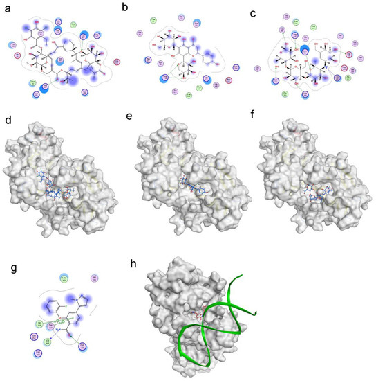 Figure 1. Molecular docking revealed binding modes of three hits and positive control with RBPJ protein by using MOE. Two-dimensional and three-dimensional docking poses of fidaxomicin (a,d), schaftoside (b,e), acarbose (c,f), and positive control RIN1 (g,h) at active sites of RBPJ were represented, respectively, showing the shape complementarity and the H-bonding with key contributing amino acids of RBPJ.