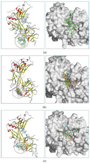 Figure 2. The inhibitory abilities of three hits were investigated in a docking experiment. Three fidaxomicin molecules (a), or four schaftoside molecules (b), or three acarbose molecules (c) could strictly occupy the active site of RBPJ that is indicated by a red dashed circle.