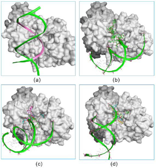 Figure 3. The verification on the abilities of small inhibitors to inhibit the formation of the NICD–MAML–RBPJ–DNA complex. The original DNA bound complex is shown (a). The occupancy of three fidaxomicin (b), four schaftoside (c) or three acarbose (d) molecules in the active site would inhibit the binding of DNA, indicating the DNA-competitive ability of the three hits.
