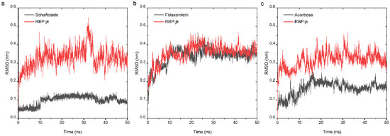 At the second stage of drug repurposing, we further performed an all-atom molecular dynamic (MD) simulation to investigate the dynamic behavior of both selected hits and RBPJ and to assess their binding stability. The obtained poses consisting of each hit and RBPJ were subjected to 50 ns all-atom MD simulation. The stability profile of three hits in complex with RBPJ was examined by using their respective root mean square deviation (RMSD) values throughout all the simulation runs. As RMSD provides the degree of conformational variability of a protein, a ligand, or a ligand–protein complex, a high RMSD value for one ligand would indicate its incompatibility with the active site of the protein, as well as insufficient stability of the ligand–receptor complex across MD simulation time-frames. RMSD values for the Cα backbone of RBPJ and each compound were calculated and are shown in Figure 4. For the schaftoside–RBPJ complex, both RMSD curves of schaftoside and RBPJ exhibited relatively stable fluctuations with the fluctuation amplitude being less than 0.1 nm, suggesting that the MD simulations reached equilibrium after 10 ns and schaftoside bound tightly to the active site of RBPJ. Similarly, fidaxomicin and acarbose formed stable complexes with RBPJ because both systems were well equilibrated after 30 ns and yielded relatively steady RMSD values.