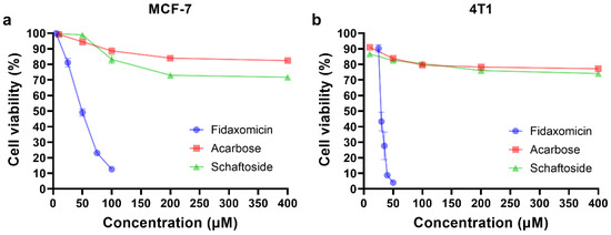 Figure 5. In vitro cytotoxicity analysis. (a) Cytotoxicity test in human breast cancer MCF-7 cells. (b) Cytotoxicity test in mouse breast cancer 4T1 cells. The cells were incubated with various concentrations of fidaxomicin, acarbose, or schaftoside for 48 h, and the viability of cells was examined by CCK-8 assay (n = 5 samples per group).