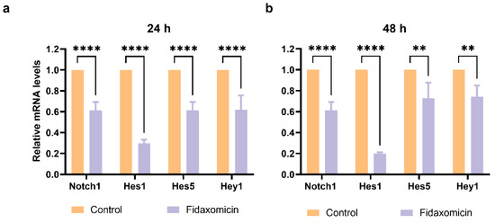 Figure 7. The mRNA levels of Notch target genes in 4T1 cells after incubation with fidaxomicin for a variety of times. (a) The results of a 24 h incubation with fidaxomicin; (b) the results of a 48 h incubation with fidaxomicin. qRT-PCR analysis revealed that the incubation of fidaxomicin significantly reduced the mRNA levels of Notch1, as well as Notch target genes Hes1, Hes5, and Hey1. Data shown represent the mean ± SD of triplicate experiments (** p < 0.01, and **** p < 0.0001 vs. control group).