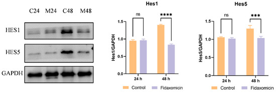 Figure 8. Western blot analysis of protein levels of Notch target molecules in 4T1 cells. C24 and C48 denote the protein levels in untreated 4T1 cells after culture for 24 h and 48 h, respectively. M24 and M48 indicate the protein levels in cells after fidaxomicin treatment for 24 h and 48 h, respectively. After incubation, whole-cell extracts were subjected to immunoblot analysis and incubated with antibodies to Hes1, Hes5, and GAPDH as a control. Data shown represent the mean ± SD of triplicate experiments (*** p < 0.001, and **** p < 0.0001 vs. control group, ns: no significance).