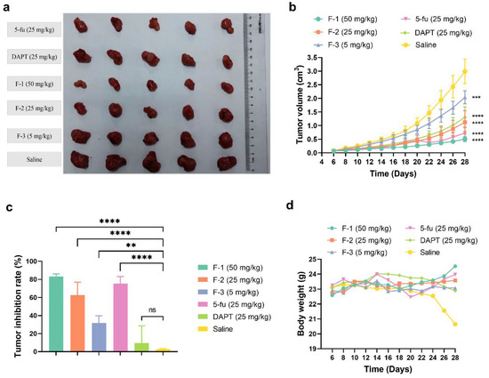 Based on the in vitro cytotoxicity and the responses of inhibiting the Notch signaling, the antitumor efficacy of fidaxomicin in 4T1-tumor-bearing mice was then evaluated. When the average tumor volume reached about 100 mm3, mice were treated with different groups of drugs by intratumoral administration every other day for three weeks, including 5, 25, and 50 mg/kg fidaxomicin, 25 mg/kg DAPT, 25 mg/kg 5-fluorouracil, and saline as a negative control. As shown in Figure 9a,b, the tumor volume of the saline group increased rapidly and reached 3000 mm3 on the 28th day after the implantation.