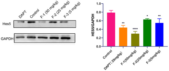 Figure 10. Relationship between in vivo anti-tumor activity of fidaxomicin and the inhibition in Notch signaling in 4T1 tumors. Western blot analysis of protein levels of Notch targets Hes5 in 4T1 tumors was performed after administration with saline, DAPT (25 mg/kg), fidaxomicin (50 mg/kg), fidaxomicin (25 mg/kg), and fidaxomicin (5 mg/kg). Data shown represent the mean ± SD of triplicate experiments (* p < 0.05, ** p < 0.01, and **** p < 0.0001 vs. control group).