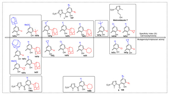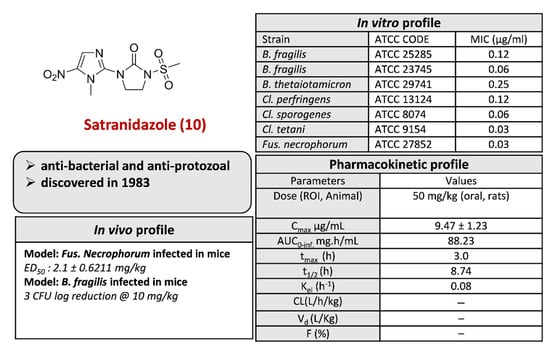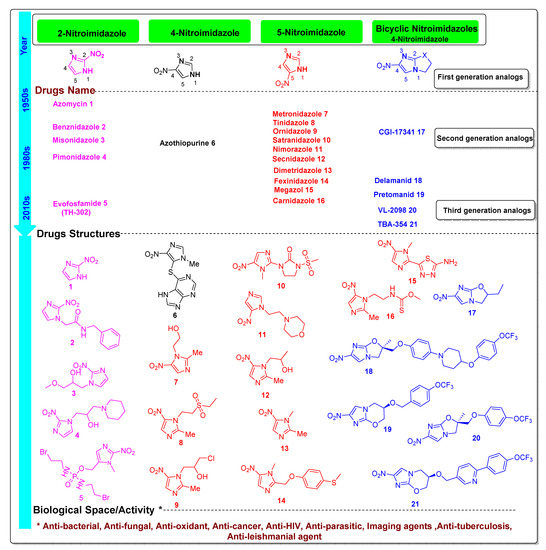During the past decade, the attrition rate of drug development candidates reaching the market has been decreased and has become one of the significant challenges in pharmaceutical research and drug development (R&D). Several issues have arisen to explain the decrease in pharmaceutical industry productivity, including the non-optimal physicochemical properties of hits, leads and clinical candidates, affecting their absorption, distribution, metabolism, elimination, and toxicity (ADMET) profiles, and consequently, their drug-like properties [1,2]. Several strategies have been developed to solve these issues, such as (1) target-based approaches (e.g., fragment-based approach, drug-design approach) and (2) phenotypic screening approach, as well as the scaffold hopping approach and functionalization of the known scaffold [3]. In this direction, the nitroimidazole scaffold was discovered in the early 1950s and was reported for anti-bacterial potential, which was highly exploited regarding its chemistry and pharmacological space, and thereafter, several drugs and clinical candidates have been generated. Figure 1 below shows the timeline and selected related chemical structures of the nitroimidazole series and their therapeutic applications, clearly showing the interest of drug development of this scaffold [1].