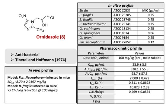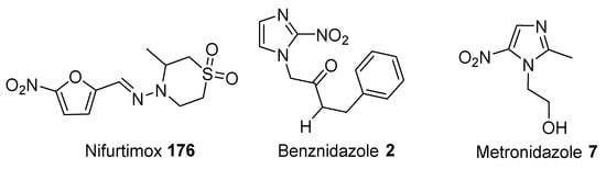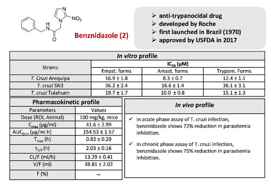 Benznidazole 2, belongs to the 2-nitroimidazole-based drug used in the treatment of Chagas disease, a disease caused by the protozoan parasite, Trypanosoma cruzi (Figure 5). Benznidazole 2 was developed and commercialized by Roche and was first launched in Brazil (in 1970) [45]. Recently, in 2017, the FDA has also given an accelerated approval for pediatric use [46]. Benznidazole 2 has shown good in vitro results against several strains of Trypanosoma such as Trypanosoma cruzi Arequipa, Trypanosoma cruzi SN3, Trypanosoma cruzi Tulahuen in all the three different stages, i.e., extracellular epimastigote (Emast.), intracellular amastigote (Amast.) and trypomastigote (Trypom.). Moreover, Benznidazole 2 has shown good in vivo activity against both acute and chronic mice models of infection [47,48]. The pharmacokinetic parameters studied by Perin et al. suggest that Benznidazole 2 has rapid and low absorption after oral administration (100 mg/kg, in mice). In clinical studies, it has been observed that benznidazole 2 has a better parasitological cure rate in patients with acute infection. Benznidazole 2 is an orally administered drug (with a human dose of 5–10 mg/kg/day for 30–60 days) and has been in use for the past ~50 years [49].