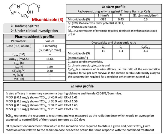Misonidazole (MISO, 3) is another 2-nitroimidazole derivative discovered as a radiosensitizer to sensitize resistant hypoxic tumor cells toward treatment [55]. Misonidazole 3 has shown good in vitro, in vivo radio-sensitizers properties and pharmacokinetics properties (Figure 6) [55]. In the clinical study, none of the clinical trials demonstrated significant results, except for one where the small degree of radiosensitization was observed at a dose lower than the clinically recommended dose [56].