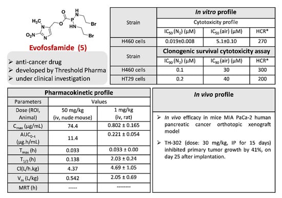 Evofosfamide 5 (formerly known as TH-302) is an investigational hypoxia-activated drug developed by Threshold Pharmaceuticals in 2012 and is in clinical development for cancer treatment (Figure 8) [66,67,68,69,70]. Evofosfamide was designed by coupling 2-nitroimidazole and brominated derivative of isophosphoramide mustard. The prodrug is activated under hypoxic conditions typical of solid tumor cancer cells [70]. Evofosfamide 5 undergoes a one-electron reduction by ubiquitous cellular reductases, which under low oxygen conditions, releases a DNA-crosslinking anti-cancer agent, phosphoramidate. Evofosfamide 5 was selectively potent under hypoxia conditions and stable toward the hepatocytes. In an in vivo efficacy study, evofosfamide was found to be active in a pancreatic (MIA PaCa-2) cancer orthotopic xenograft model as a monotherapy. Moreover, its combination with gemcitabine also showed dramatic efficacy [14]. It is being studied in clinical trials as a therapeutic agent [66].