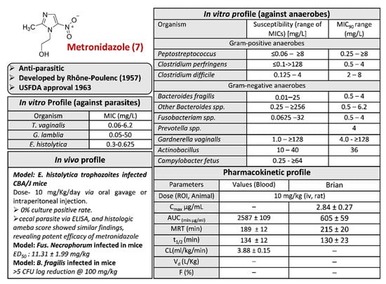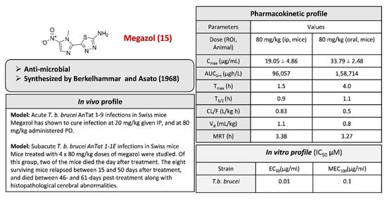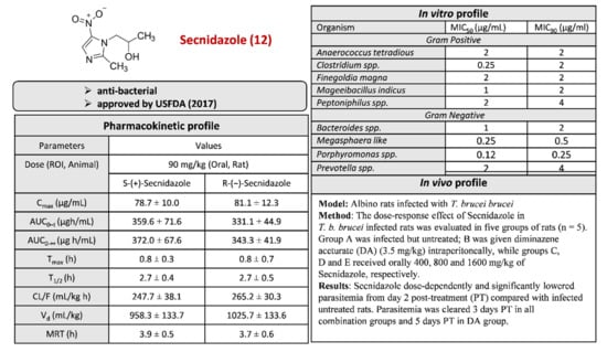 - Eke, I.G.; Eze, I.O.; Ezeudu, T.A.; Eze, U.U.; Anaga, A.O.; Onyeyili, P.A. Anti-trypanosomal activity of secnidazole in vitro and in vivo. Trop. J. Pharm. Res. 2017, 16, 535. [Google Scholar] [CrossRef]