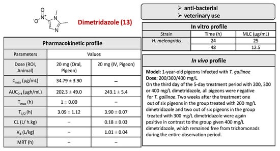- Inghelbrecht, S.; Vermeersch, H.; Ronsmans, S.; Remon, J.-P.; DEBACKER, P.; Vercruysse, J. Pharmacokinetics and anti-trichomonal efficacy of a dimetridazole tablet and water-soluble powder in homing pigeons (Columb a livia). J. Vet. Pharmacol. Ther. 1996, 19, 62–67. [Google Scholar] [CrossRef]