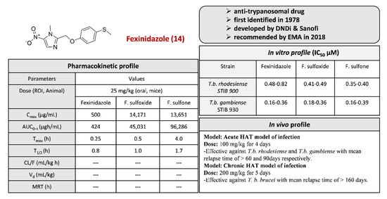 - Deeks, E.D. Fexinidazole: First Global Approval. Drugs 2019, 79, 215–220. [Google Scholar] [CrossRef]