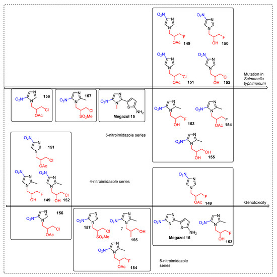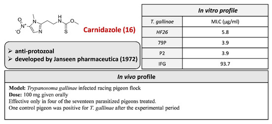 The 5-nitroimidazole scaffold [6] was the starting point to the synthesis of numerous analogs, and one among such is Metronidazole 7 ((Flagyl®, Rhône-Poulenc, France), which has shown potent anti-protozoal activity and lesser toxicity than Azomycin 1 (Figure 3) [7]. Metronidazole 7 was the first systemically active medicine against Trichomonas vaginalis and Trichomonas foetus. Currently, Metronidazole 7 is used to treat bacterial vaginosis, trichomonas, amebiasis, and non-sporing anaerobic bacterial infections caused by Bacteroids fragilis [8]. The 5-nitroimidazole moiety is well known for its broad spectrum of anti-infectious activity [9]. A specific review on the anti-infectious activity of 5-nitroimidazole has been emphasized by Crozet et al [6]. For instance, Metronidazole 7 (Flagyl®, developed by Rhône-Poulenc, France), Tinidazole 8 (Fasigyne®, developed by Pfizer, Brooklyn, NY, USA), Ornidazole 9 (Tiberal®, developed by Hoffmann-La Roche, Basel, Switzerland), Satranidazole 10, Nimorazole 11 (Nitrimidazine, Naxogin®, developed by Carlo Erba, Cornaredo, Italy), Secnidazole 12 (Secnol®, developed by Symbiomix, Newark, NJ, USA), and Dimetridazole 13 (Emtryl®, developed by Rhône-Poulenc, France) are other members of this class of drugs commonly used in medicine. Apart from these, Fexinidazole 14 (Sanofi, France & DNDi) represents another 5-nitroimidazole-based drug [10], which has replaced the old and highly problematic treatment techniques and is an oral, safe and effective short-course treatment for human African trypanosomiases. Fexinidazole 14 is free of genetic toxicity in mammalian cells [1]. Other 5-nitroimidazole-based candidates are Megazol 15 (discovered by American Cyanamid Company, Bridgewater Township, NJ, USA), used against protozoan infections and Carnidazole 16 (Spartrix, Pantrix, Gambamix®, developed by Janssen, Pharmaceutica NV, Beerse, Belgium) used in the veterinary field.