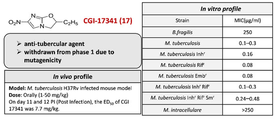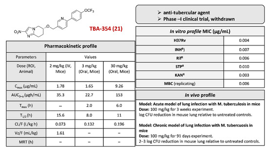 In the last decade, nitroimidazole derivates belonging to bicyclic-fused nitroimidazole has also shown great potential in TB drug discovery [14,15]. The first fused nitroimidazole reported was CGI-17341 17 (Hindustan Giba-Geigy, Figure 1), which displayed in vitro and in vivo antitubercular activities [16]. CGI-17341 17 was found to be active against multidrug-resistant strains. Unfortunately, the development of this compound was discontinued due to its mutagenic side effects [17,18]. Almost 10 years after, two new bicyclic nitroimidazoles were developed, OPC-67683 18 (Delamanid, by Otsuka Pharmaceuticals, Tokyo, Japan) [1] and PA-824 19 (Pretonamid, by PathoGenesis, USA and TB Alliance, New York, NY, USA) [1] without any mutagenic effects (Figure 1). Delamanid was approved for the pulmonary multidrug-resistant TB by the European Medicines Agency (EMA) in 2014 in adult patients [19]. In contrast, Pretomanid 19 was approved in 2019 for the treatment of TB. Recently, the Global Alliance for TB drug development and the University of Auckland advanced in Phase I of TBA-6354 21 but showed neurotoxicity in healthy volunteers [20]. This class of nitroimidazole derivatives has also shown promising potential in leishmanasis drug discovery, which needs an effective oral treatment option [21]. This good profile has also attracted significant interest. Another structure in this class, VL-2098 20, Ref. [17] has also been reported.