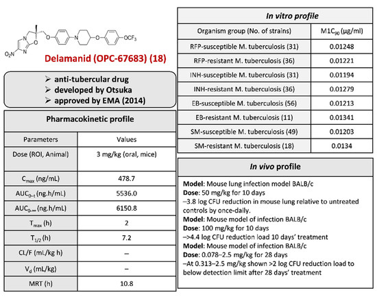 - Matsumoto, M.; Hashizume, H.; Tomishige, T.; Kawasaki, M.; Tsubouchi, H.; Sasaki, H.; Shimokawa, Y.; Komatsu, M. OPC-67683, a nitro-dihydro-imidazooxazole derivative with promising action against tuberculosis in vitro and in mice. PLoS Med. 2006, 3, e466. [Google Scholar] [CrossRef]