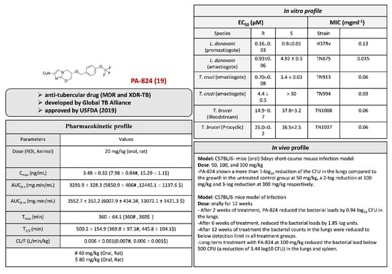 - Patterson, S.; Wyllie, S.; Stojanovski, L.; Perry, M.R.; Simeons, F.R.C.; Norval, S.; Osuna-Cabello, M.; Rycker, M.D.; Read, K.D.; Fairlamb, A.H. The R Enantiomer of the Antitubercular Drug PA-824 as a Potential Oral Treatment for Visceral Leishmaniasis. Antimicrob. Agents Chemother. 2013, 57, 4699–4706. [Google Scholar] [CrossRef] [PubMed]