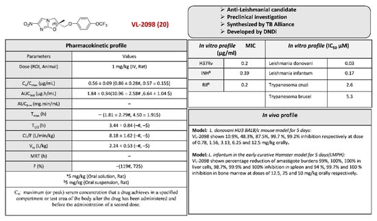 - Patterson, S.; Wyllie, S.; Norval, S.; Stojanovski, L.; Simeons, R.F.; Auer, J.L.; Osuna-Cabello, M.; Read, K.D.; Fairlamb, A.H. The anti-tubercular drug delamanid as a potential oral treatment for visceral leishmaniasis. Elife 2016, 5, e09744. [Google Scholar] [CrossRef]