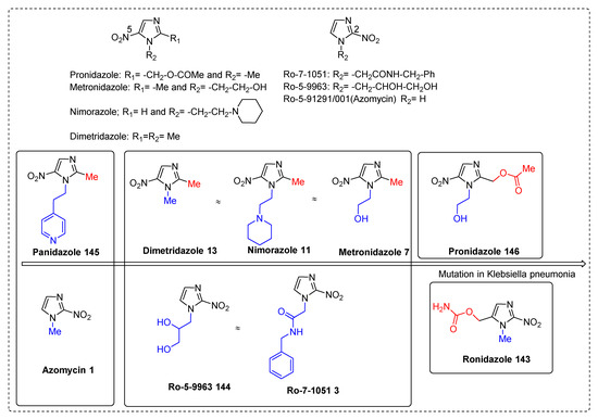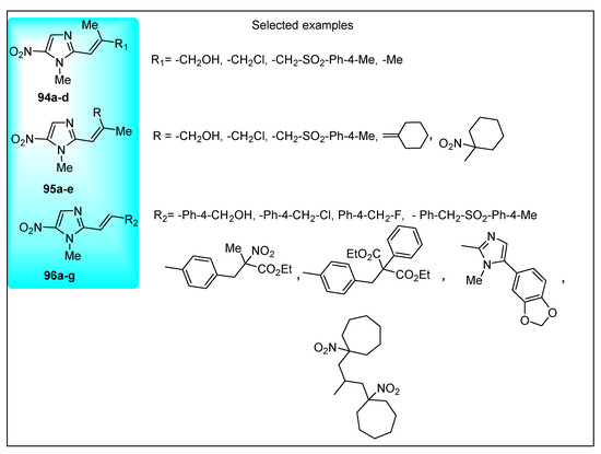 Nitroimidazole represents a unique scaffold in drug discovery and development, has given many successful drugs and clinical candidates, and is still being pursued for medicinal chemistry exploitation. Considering its wide and interesting biological activities, several reviews and books were published. However, most of them were focused on their pharmacological profiles [1,6,18,22,23,24,25]. There are few reviews that cover the partial synthetic aspects of this scaffold [26,27,28], and considering its wide application and the presence of diverse space around this scaffold, there should be a consolidated review covering chemistry, pharmacological and recent development. These wonderful chemical series have given numerous analogs and regio-isomers as potential drug candidates for several therapeutic conditions such as anti-bacterial, anti-cancer, anti-HIV, anti-parasitic, anti-tuberculosis, anti-leishmaniasis agents, etc., as well as imaging agents in medicine. Figure 3 summarizes the transition from simple nitroimidazole to functionalized and optimized nitroimidazole-based drug and candidates.