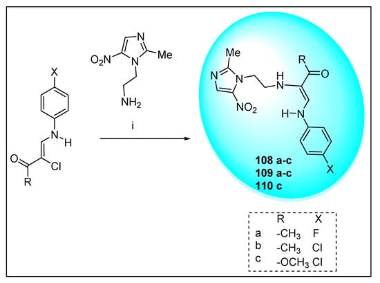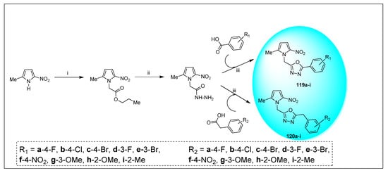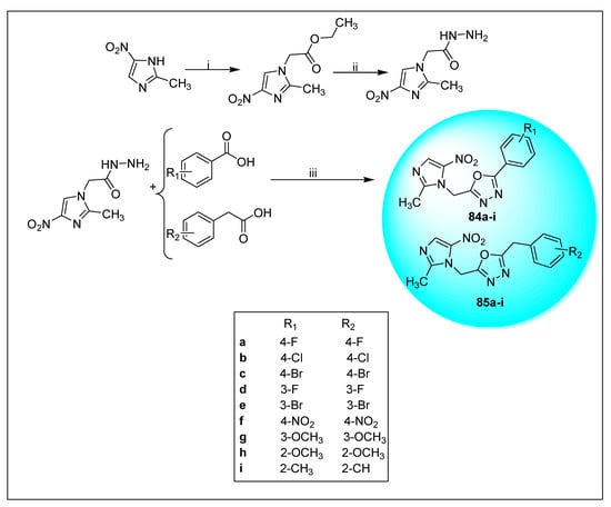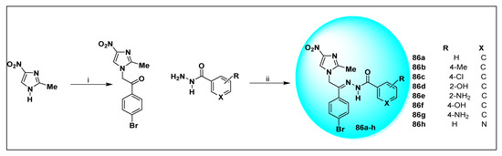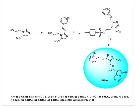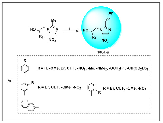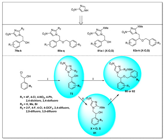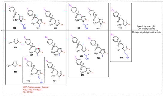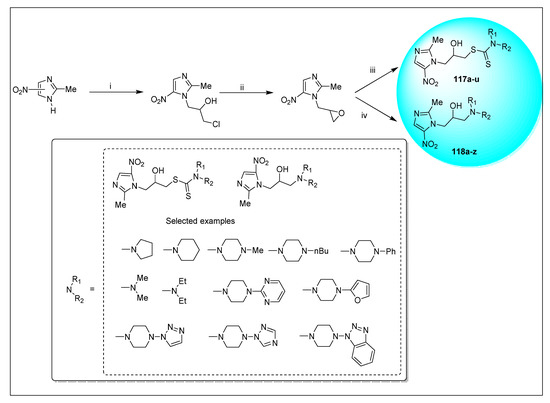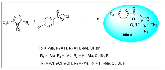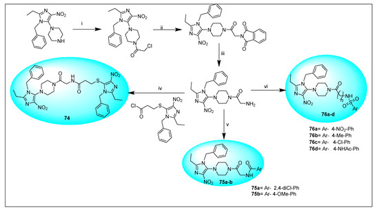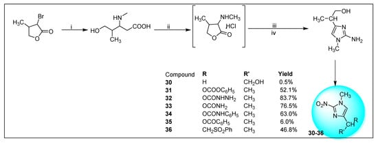 Cavalleri et al. performed the modification of 2-nitromimdazole and evaluated them as antitrichomonas agents. In this study, the authors synthesized several analogs (30–36), and among them, one molecule 30 has shown better potency and lesser toxicity as compared to the standard molecule (Scheme 10 and Table 2) [72].