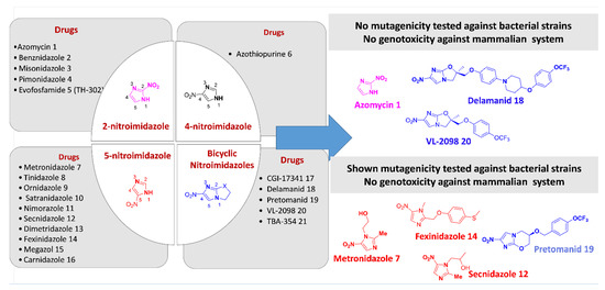 - Voogd, C.E. On the mutagenicity of nitroimidazoles. Mutat. Res. 1981, 86, 243–277. [Google Scholar] [CrossRef]