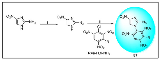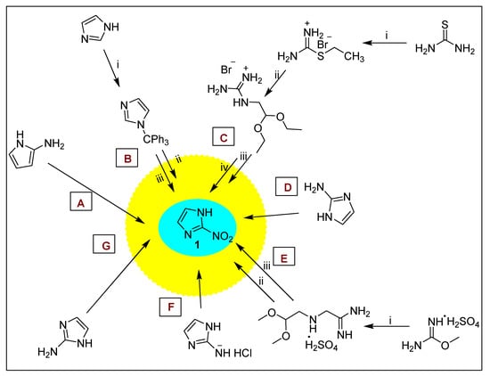 Azomycin 1 represents the first nitroimidazole-based compound for therapeutic application and was first isolated from the bacteria’s culture, followed by attempts toward its synthesis (Scheme 1, routes A–G). In the initial days, the challenges posed for its synthesis led to the discovery of other regio-isomers (5-nitroimidazole and 4-nitroimidazole derivatives). As shown in Scheme 1, in 1965, Beaman et al. made a first successful attempt to synthesize 2-nitroimidazole from 2-aminoimidazole via two-step reactions (i) diazotization followed by (ii) nitration (route A) [39]. In 1982, Cohen et al. developed another synthetic route starting from imidazole, where imidazole was first converted to N-trityl imidazole. The N-trityl imidazole was then treated with n-butyl lithium to obtain 2-lithio intermediate, which upon treatment with n-propyl nitrate followed by acid hydrolysis, furnished 2-nitroimidazole 1 (route B) [26].