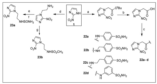 Winum et al. synthesized sulfonamides and sulfamides containing Benznidazole derivatives (22 and 23) and evaluated them as radio/chemosensitizing agents that target the tumor-associated carbonic anhydrase (CA) isoforms I, II, IX and XII. Most of the compounds have shown nanomolar activity against CA IX and XII (Scheme 3) [54].
