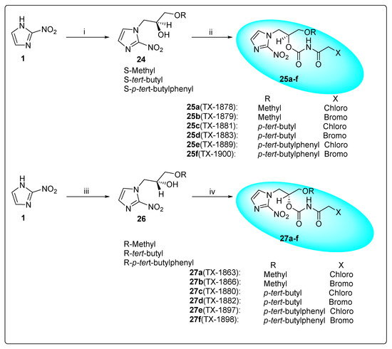 Jin et al. in 2004 designed the Misonidazole-based derivatives (TX) as dual function anti-angiogenic and hypoxia cell radio-sensitizers, wherein 2-nitroimidazole moiety is for hypoxic cell radiosensitization, and the second part contains a haloacetyl carbamoyl group as an anti-angiogenesis pharmacophore [61]. Twelve compounds were synthesized using epichlorohydrin as a chiral starting material wherein the single stereocenter connects a haloacetylcarbamoyl, 2-nitroimidazolyl, and diverse alkyl or aryl groups of varying steric dimensions (Scheme 5 and Table 1). Then, the synthesized compounds were tested for protease inhibition, in vitro anti-angiogenic activity using RLE cell proliferation assay and a chick embryo CAM assay, as well as for hypoxic cell radiosensitizers. The evaluation in the latter assay revealed that R-enantiomer having the bulky 4-tert-butylphenyl group displayed higher anti-angiogenic activity, while the enantiomers bearing the less bulky methyl and tert-butyl groups did not show any differences in activity. Among all, compound 27f (TX-1898) has been identified as a potent anti-angiogenic hypoxic cell radiosensitizer that can be explored for further development.