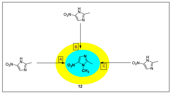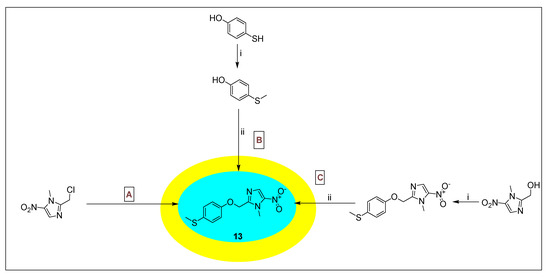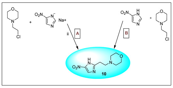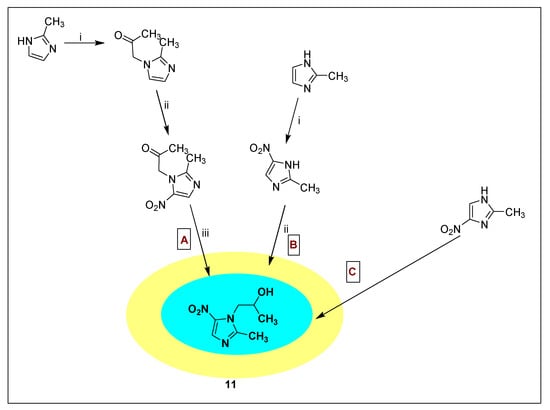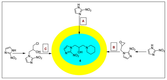 The synthesis of Pimonidazole 4 has been reported by three routes (Scheme 6, route A–C). In the first route, Pimonidazole 4 was synthesized by condensation of 2-nitroimidazole with 3-(1-piperidino)propylene oxide in refluxing ethanol. In route B, nitroimidazole reacted with epichlorohydrin followed by condensation with piperidine in refluxing ethanol. In route C, Pimonidazole 4 was synthesized by reacting 1,3-dichloropropane-2-ol with 2-nitroimidazole followed by condensation of a generated intermediate (1-(3-chloro 2 hydroxypropyl)-2-nitroimidazole) with piperidine in ethanol [64].