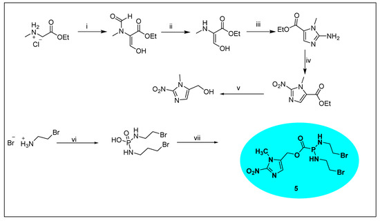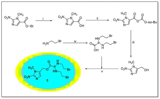 Duan et al. in 2008 developed a method for the synthesis of Evofosfamide 5 (Scheme 8) [13]. In this method, synthesis of Evofosfamide 5 was carried out by hydrolysis of ethyl-1-methyl-2-nitroimidazole-5-carboxylate followed by a reaction with isobutylchlorocarbonate, resulting in the formation of anhydride (Scheme 8). The reduction of anhydride intermediate produced 1-methyl-2-nitroimidazole-5-yl methanol, which underwent Mitsunobu reaction to produce the desired product.