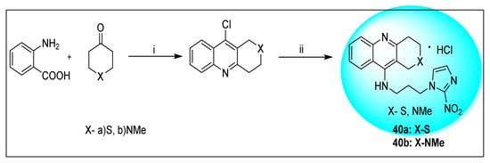 Papadopoulou in 2004 also synthesized novel nitroimidazole-based bioreductive compounds, 10-[3-(2-nitroimidazolyl)-propylamino]-3,4-dihydro-1H-thiopyrano [4,3-b]quinoline hydrochloride (39a) and 10-[3-(2-nitroimidazolyl)propylamino]-2-methyl-1,2,3,4-tetrahydro-benzo[b]-1,6-naphthyridine hydrochloride (39b) and evaluated in V79 cells hypoxia-selective cytotoxins and radiosensitizers that target DNA through weak intercalation. Both compounds were relatively good radiosensitizers (C1.6 values of 40.0 ± 0.8 and 59.0 ± 0.4 μM for 39a and 39b, respectively) but less potent cytotoxins (Scheme 13) [75].