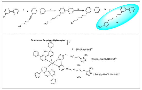 Mazuryk et al. (2017) designed the nitroimidazole-based derivatives of polypyridyl ruthenium complexes 47 as anticancer agents (Scheme 16). The detailed biological investigation was performed for the ruthenium polypyridyl complexes comprising two 4,7-diphenyl -1,10-phenanthroline ligands; one unmodified 2,2′-bipyridyl or modified with 2-nitroimidazole moiety attached by shorter or longer linkers induced cell death. They evaluated the cytotoxicity and proliferation assays of Ru polypyridyl complexes 47 that reveal toxic potential of these compounds against human pancreas carcinoma PANC-1 cell line versus normal human keratinocytes HaCaT with IC50 values of 3-5μM. Then, the authors revealed the mechanism of Ru complexes toward their anti-cancer potential. The Ru complexes accumulate in the mitochondria and inhibit DNA synthesis, arresting the cell cycle in S-phase [78].