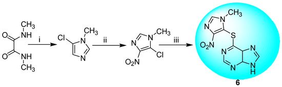 Among the classes, 2-imidazole-based drugs and leads are being used as potential anti-protozoals as well as radio-sensitizers and diagnostic markers for several cancers. These activities exploit the nitro functionality of the candidate, which undergoes reduction under hypoxia and irradiation and generates the reactive intermediates that ultimately interact with important cellular components such as DNA, RNA and proteins, thus inhibiting growth. 2-Nitroimidazole-based drugs such as Benznidazole 2 show anti-protozoal activity because of the formation of free radicals and electrophilic metabolites, when its nitro group is reduced by the action of nitroreductases. The metabolites covalently bind to macromolecules of the parasite and are responsible for the trypanocidal effect and anti-protozoal effect [31]. There is one drug belonging to nitroimidazole class named as Azathiopurine 6, which is known for its immunosuppression property. Glutathione and similar compounds of the intestinal wall, liver and red blood cells mediate the reductive cleavage of the thioether (-S-) due to which Azathioprine 6 converts to 6-mercaptopurine (6-MP) [32,33,34]. Azathioprine 6 interferes with purine synthesis and disrupts DNA and RNA synthesis, thus causing immunosuppression [35].