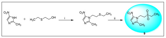 - Chandorkar, J.G.; Umbarkar, S.B.; Rode, C.V.; Kotwal, V.B.; Dongare, M.K. Synthesis of tinidazole by condensation–oxidation sequence using MoO3/SiO2 bifunctional catalyst. Catal. Commun. 2007, 8, 1550–1555. [Google Scholar] [CrossRef]