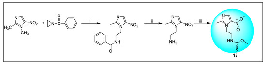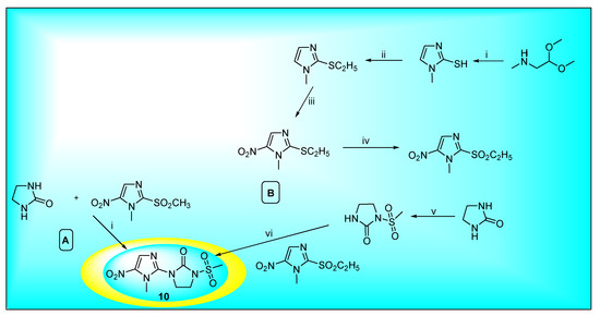 - Nagarajan, K.; Arya, V.; George, T.; Sudarsanam, V.; Shah, R. Nitroimidazoles: Part IV. 1-Sulphonyl (carbamoyl/thiocarbamoyl)-3-(1-methyl-5-nitroimidazol-2-yl)-2-imidazolidinones. Indian J. Chem. Sect. B Org. Chem. Incl. Med. Chem. 1982, 21, 928–940. [Google Scholar]